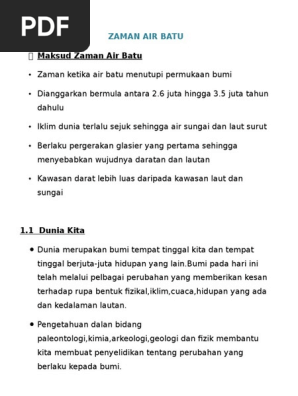 4 tahap zaman air batu. Dianggarkan bermula antara 2 6 juta hingga 3 5 juta tahun dahulu. Mari belajar sejarah 1 3 1 4 4 0 tajuk 2 zaman air batu 2 1 5 0 tajuk 3 zaman prasejarah 3 1 6 0 tajuk 4 kerajaan kerajaan melayu awal 4 1 7 0 tajuk 5 tokoh tokoh terbilang kesultanan melayu. Glasier merupakan timbunan besar ais yang bergerak perlahan lahan menuruni cerun dan merebak ke permukaan laut. Yang tidak disebabkan karena kekurangan air yang sangat besar sahara.