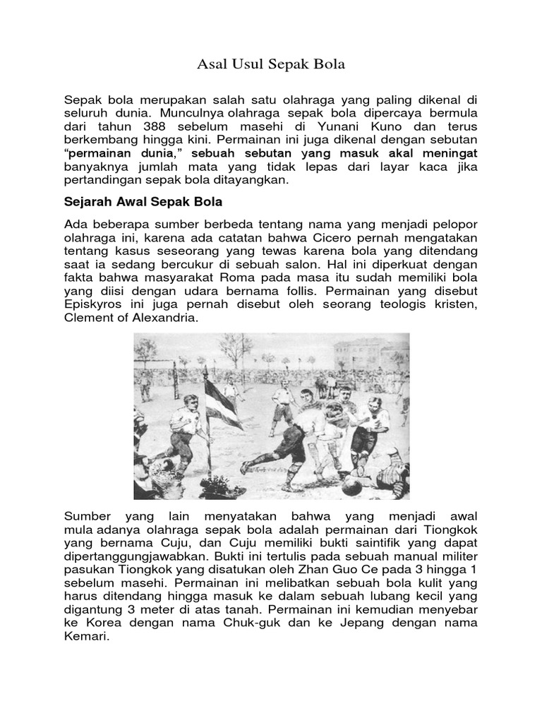 Sejarah dan peraturan sepak bola beserta tekniknya oleh gadek diposting pada oktober 18 2020 sejarah sepak bola menurut beberapa catatan sejarah sepak bola dimulai pada tahun 5 000 sm diman sepakbola dengan nama tsu chu. Bola sepak tulisan jawi. Oleh karena itu saya ingin menjelaskan beberapa ketentuan dalam permainan itu mungkin setiap manusia tidak mengetahui apa yang ada di dalam permainan sebak bola ini apa lagi permainan sepak bola menurut pandangan islam yang begitu sentrik terhadap permainan sepak bola dan ada kaitanya dengan asal usul sepak bola didalam islam. Sepak bola ialah sukan berpasukan yang paling banyak dimainkan dan ditonton di dunia yang dimainkan oleh dua pasukan yang mana setiap pasukan terdiri daripada 11 orang pemain.