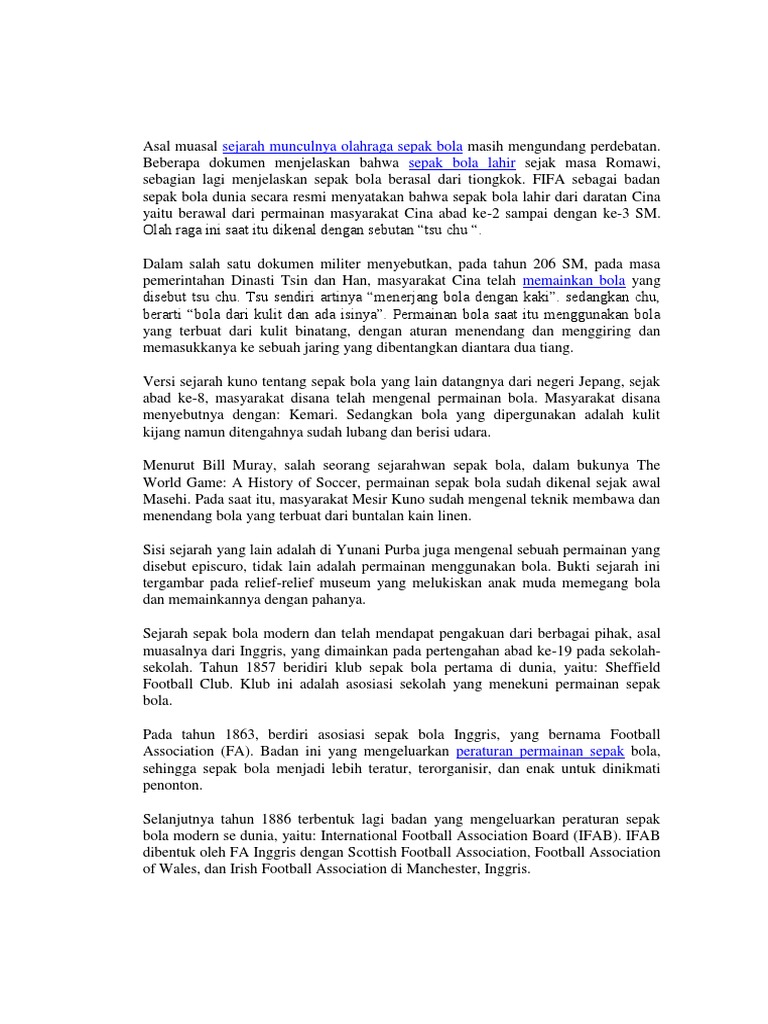 Asal usul sejarah sepak bola. Sejarah olahraga sepak bola dimulai sejak abad ke 2 dan 3 sebelum masehi di cina di masa dinasti han tersebut masyarakat menggiring bola kulit dengan menendangnya ke jaring kecil. Sepak bola pertama kali dimainkan di china tepatnya pada. Sejarah asal usul sepak bola versi asal usul sepak bola dari china sebuah buku pedoman latihan perang yang ditemukan di tahun 1887 di provinsi yanming china menyebutkan bahwa permainan sepak bola telah dimainkan oleh militer kekaisaran china sejak abad ke 2 sm. Permainan serupa juga dimainkan di jepang dengan sebutan kemari di italia permainan menendang dan membawa bola juga digemari terutama mulai abad ke 16.