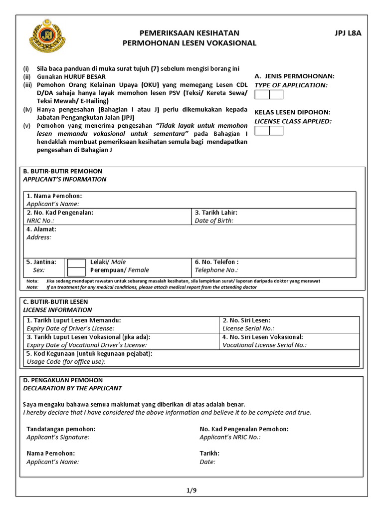 1 9 pemeriksaan kesihatan permohonan lesen vokasional jpj l8a i sila baca panduan di muka surat tujuh 7 sebelum mengisi borang ini ii gunakan huruf besar iii pemohon orang kelainan upaya oku yang memegang lesen cdl d da sahaja hanya layak memohon lesen psv teksi kereta sewa. Jabatan pengangkutan jalan aras 3 5 no. Klik sini untuk muat turun borang. By cikgu yap 2018 10 03t19 32 20 08 00 april 28th.