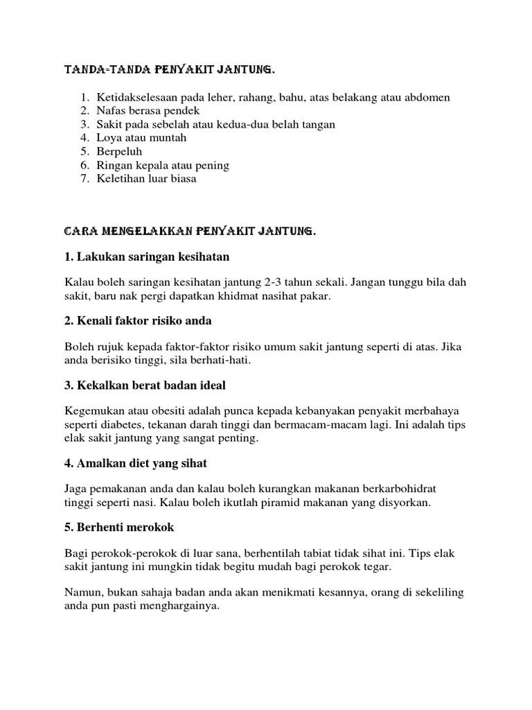 Cara mengelakkan penyakit jantung bahasa melayu. Ada lelaki berusia semuda 28 tahun dah alami sakit jantung manakala perempuan berusia semuda 32 tahun pun ada yang dah kena. Persoalannya apakah langkah langkah yang boleh diambil bagi mengelakkan diri kita daripada masalah ini. Sekiranya anda mengalami serangan jantung anda mungkin berasa bimbang dan terharu. Antara penyakit yang sering dikaitkan dengan obesiti ialah diabetes darah tinggi dan juga serangan jantung.