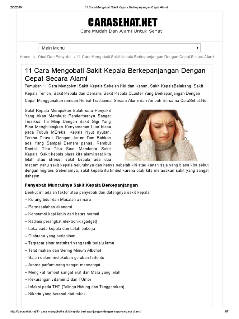 Bila seandainya anda pernah menderita sakit di kepala atau biasa disebut pusing dan pening sudah pasti efek sakitnya akan terasa hampir ke semua anggota tubuh. Penyebab dan cara menghilangkan sakit kepala berkepanjangan l info penanya. Sakit kepala yang dirasakan bisa sangat mengganggu. Pengobatan harus sesuai gejala dan rasa sakit yang dirasakan.