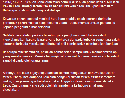 Contoh karangan berita kebakaran pt3. Ini kerana kebakaran tersebut bermula dari dapur dan didapati tong gas di situ telah meletup. Klik di sini untuk informasi file lengkap contoh karangan kebakaran pt3 selengkapnya. Contoh karangan berita kemalangan jalan raya contoh karangan contoh karangan laporan contoh karangan upsr contoh karangan berita contoh karangan ucapan contoh karangan spm contoh karangan bahasa inggris contoh karangan fakta contoh karangan keluarga contoh karangan argumentasi contoh karangan bahasa melayu contoh karangan pt3 contoh karangan singkat contoh karangan catatan. Menurut pihak bomba kebakaran itu berpunca daripada kebocoran dapur gas.