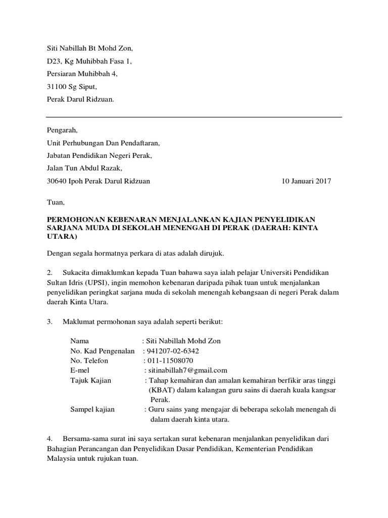 Contoh surat memohon kebenaran menjalankan penyelidikan. Mulai 1 mac 2018 bahagian perancangan dan penyelidikan dasar pendidikan bppdp akan menggunakan sistem eras 2 0 untuk menerima permohonan dan mengeluarkan surat keputusan permohonan kebenaran menjalankan kajian. Maaf saudari atiy boleh saya tahu tajuk kajian saudari. Sebab saya juga sedang dalam proses pengumpulan data utk pembentangan proposal. Related posts to surat rasmi permohonan menjalankan penyelidikan surat rasmi permohonan menjalankan penyelidikan 2018 05 31t03 32 00 07 00 rating.