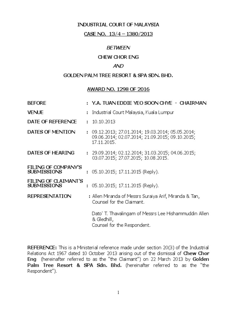 Where the court finds that the dismissal was without cause or excuse the two main remedies that are determined by the court are reinstatement of the dismissed employee and or monetary compensation for the wrongfully dismissed employee. Example of case number. Commencing from 29 june 2020 hearing of all cases in industrial court of malaysia icm will proceed as scheduled. Industrial court of malaysia court case sunday june 23 2013 award 19141 salah laku it is further ordered that the company shall pay the total amount of rm132 000 00 to the claimant through the claimants solicitor s messrs shanker arjunan within 30 days from the date of this award subject to statutory deductions if any.