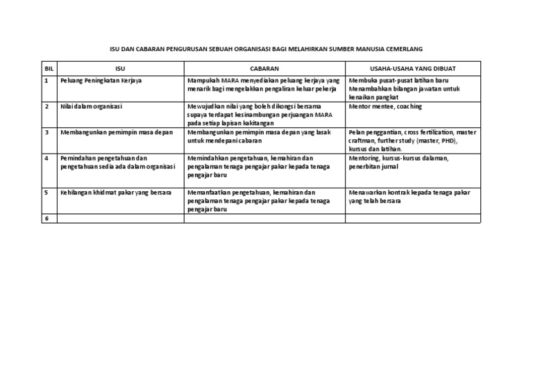 Isu dan cabaran dalam pengurusan sumber manusia. Isu dan cabaran pengurusan sesebuah organisasi bagi melahirkan sumber manusia yang cemerlang. Isu dan cabaran pengurusan sesebuah orga. Beberapa isu penting berkaitan dengan masa depan penyelidikan dalam bidang ini di malaysia dibincangkan. Kini pengurusan sumber manusia semakin menghadapi cabaran yang lebih besar dengan keadaan globalisasi yang kian mencabar dan berubah mengikut persekitarannya.