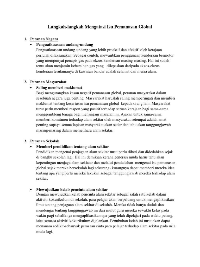 Karangan syarahan cara cara mengatasi pemanasan global. Pemanasan global disebabkan oleh peningkatan umum suhu udara dan laut di permukaan bumi. Dengan segala kebutuhan yang disediakan oleh bumi kerap kali membuat manusia menjadi serakah dan lupa bahwa kebutuhan yang disediakan ini lama kelamaan akan habis. Cara mengatasi pemanasan global dan perubahan iklim bumi yang dijadikan sebagai tempat hidup makhluk hidup umurnya memang sudah tua banyak perubahan yang terjadi didalamnya. Adakah anda mencari contoh contoh karangan bahasa melayu bagi membuat rujukan dan latihan tambahan sekiranya ya anda boleh melihat contoh seperti di bawah yang merangkumi pendahuluan isi isi penting dan penutup.