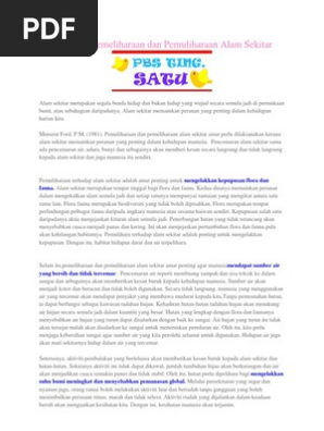 Kepentingan pemeliharaan dan pemuliharaan alam sekitar pada masa kini. Dan pemuliharaan kepentingan alam sekitar ada pada penduduk dan nilai nilai tersebut perlu dipupuk sejak kecil lagi oleh masyarakat. Usaha usaha memupuk kesedaran masyarakat terhadap kepentingan alam sekitar terus dilakukan oleh pelbagai pihak di negara ini seperti kempen kebersihan perkhemahan alam sekitar bagi belia seminar bengkel pameran promo media dan penerbitan bahan bahan cetak. Kesimpulannya kita mesti sedar akan kepentingan memelihara alam semulajadi yang masih ada pada hari ini. Dalam konteks alam sekitar sudah tentu kedua dua perkataan tersebut berkaitan dengan proses pemeliharaan dan pemuliharaan alam sekitar.