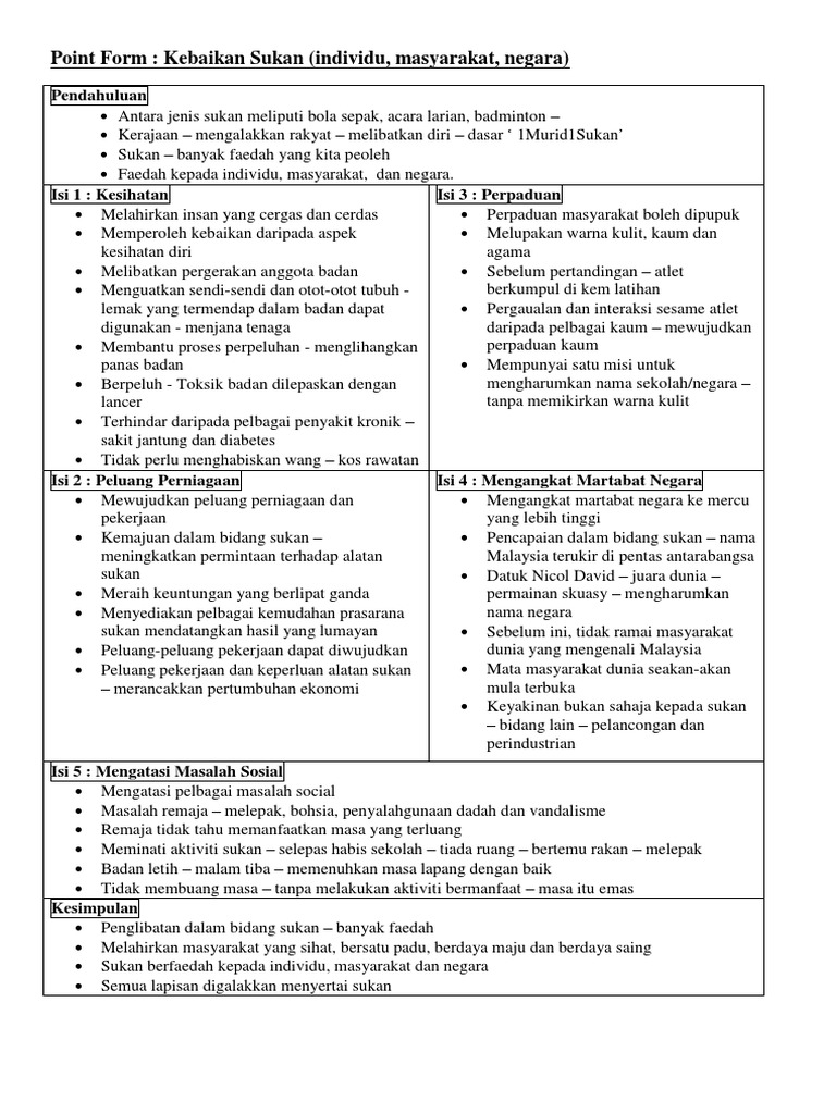 Oleh itu pihak yang bertanggungjawab dalam bidang sukan perlulah memainkan peranan yang berkesan dengan kerjasama semua pihak seperti ibu bapa. Memupuk perpaduan kaum c. Pelbagai rangka karangan sukan yang sesuai untuk karangan spm dan stpm. Sukan merupakan satu aktiviti riadah yang paling sesuai dilakukan oleh pelbagai lapisan masyarakat negara ini.