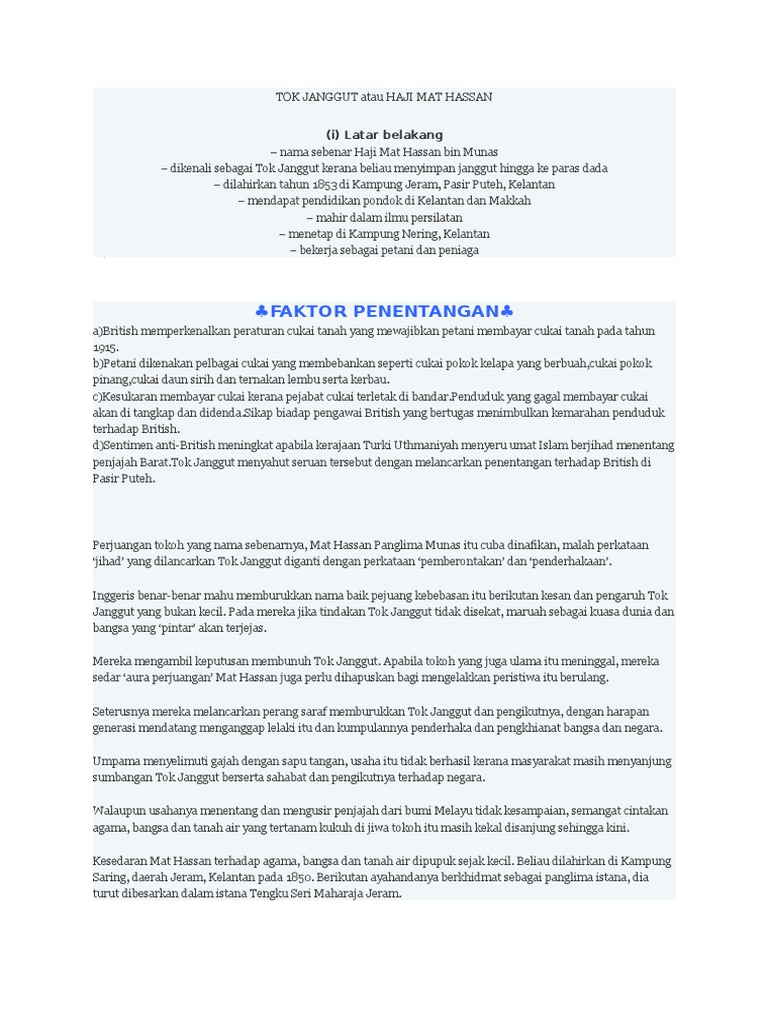 Latar belakang tok janggut pdf. Hassan bin panglima munas yang lebih dikenali sebagai tok janggut. Berikutan bapanya juga merupakan seorang panglima istana tidak hairanlah masa kecilnya turut dihabiskan di istana tengku seri maharaja jeram. Tok janggut tok janggut atau haji mat hassan i latar belakang nama sebenar haji mat hassan bin munas dikenali sebagai tok janggut kerana beliau menyimpan janggut hingga ke paras dada dilahirkan tahun 1853 di kampung jeram pasir puteh kelantan mendapat pendidikan pondok di kelantan dan makkah mahir dalam ilmu persilatan. Pemimpin gerakan penentangan di negeri ini adalah haji abdul rahman bin haji abdul hamid bin haji abdul qadir 1868 1929.