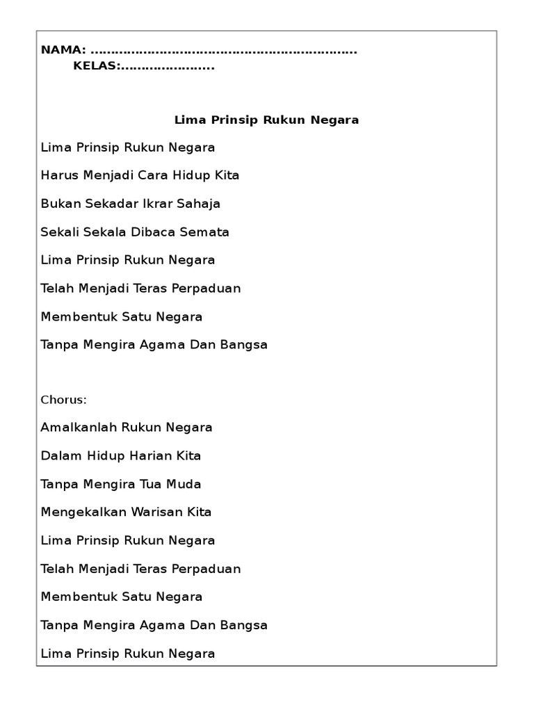 Lirik lagu lima prinsip rukun negara. Lima prinsip rukun negara lima prinsip rukun negara harus menjadi cara hidup kita bukan sekadar ikrar sahaja sekali sekala dibaca semata lima prinsip rukun negara telah menjadi teras perpaduan membentuk satu negara tanpa mengira agama dan bangsa chorus. Demikianlah bagaimana dalam situasi yang genting yang di pertuan agong telah menyelamatkan negara dengan cara memupuk kembali perpaduan dalam kalangan rakyat. Justeru beliau berkata lima prinsip yang terkandung dalam rukun negara wajar diperkasakan semula supaya ia dapat dihayati dan diamalkan oleh masyarakat terutama generasi muda.