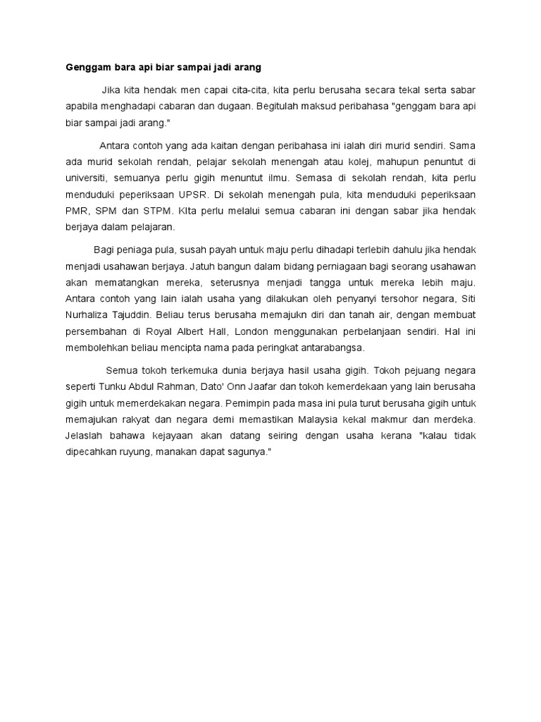Jika melakukan pekerjaan yang susah haruslah dengan sabar sehingga mendapat nikmatnya nanti. Genggam bara api biar sampai jadi arang posted by bahasaku indah at 9 37 ptg. Peribahasa genggam bara api biar sampai jadi arang dapat anda gunakan dalam kehidupan sehari hari baik dalam bentuk lisan maupun tulisan sebagai suatu perumpamaan yang mempunyai arti dalam melakukan suatu pekerjaan yang sulit hendaknya bersabar agar dapat sukses. Semasa membuat sesuatu pekerjaan yang susah hendaklah sabar dan tabah sehingga mencapai kejayaannya.
