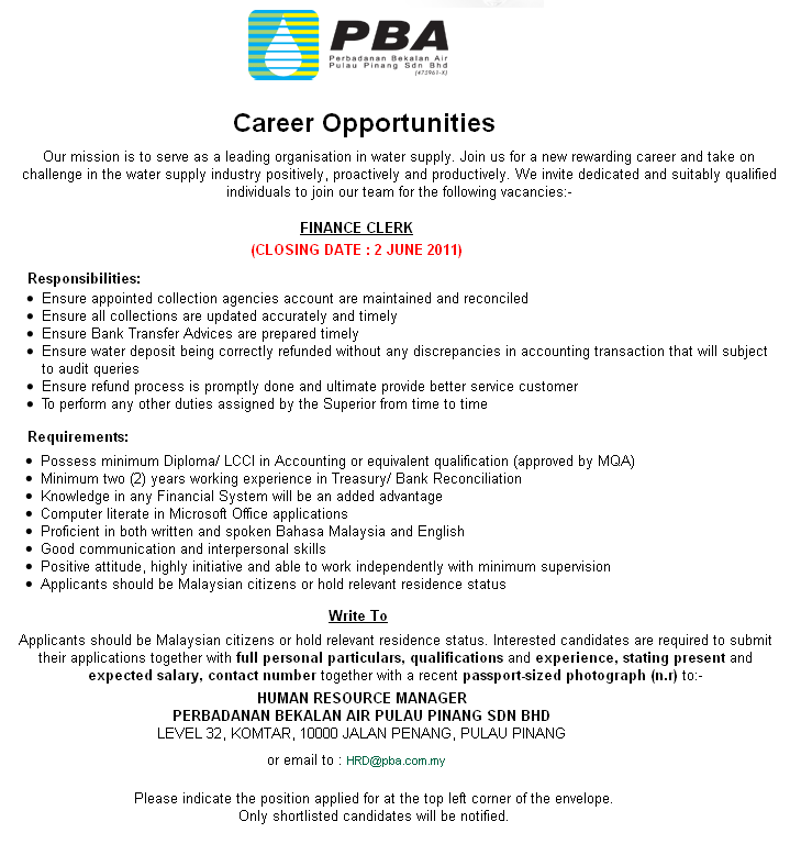 Perbadanan bekalan air pulau pinang career. Pulau pinang tarikh tutup permohonan. 1 clerk operations department responsibilities. Page 1 of 13 jobs. Portal jawatan kosong ingin berkongsi maklumat peluang pekerjaan di perbadanan bekalan air pulau pinang pbapp yang kini dibuka untuk warganegara malaysia dan kepada mereka yang berminat serta berkelayakan dipelawa untuk mengisi kekosongan jawatan ini seperti berikut maklumat jawatan kosong pbapp jawatan yang ditawarkan.