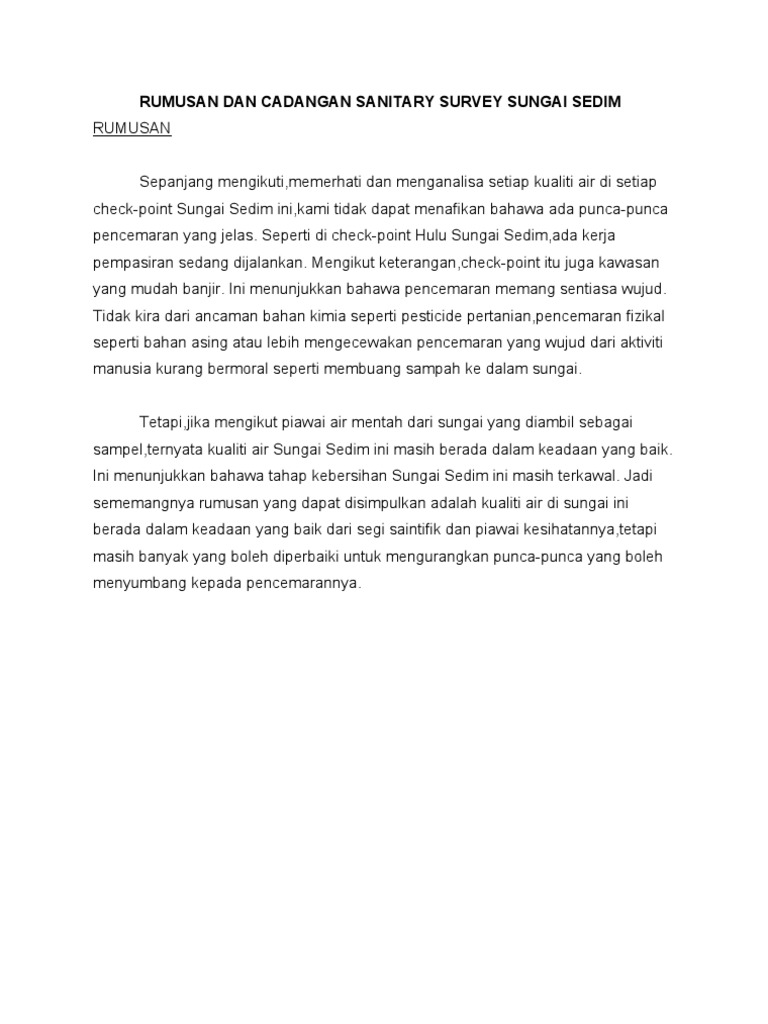 Punca punca pencemaran sungai rumusan. Kini banyak punca air kita tercemar sehingga didapati bahawa jika tiada sebarang langkah diambil ia mungkin memudaratkan kehidupan manusia. Namun pembangunan yang tidak mengambil kira ataupun tidak diseimbangkan dengan kemampuan alam sekitar sudah semestinya akan menyebabkan konsep pembangunan berterusan tidak dapat direalisasikan. Bahan bahan buangan domestik yang terdiri daripada sampah sarap dan bahan kumbahan dibuang sewenangwenangnya ke dalam sungai. Antara punca ialah sikap manusia yang diibaratkan sebagai enau dalam belukar melepaskan pucuk masing masing.