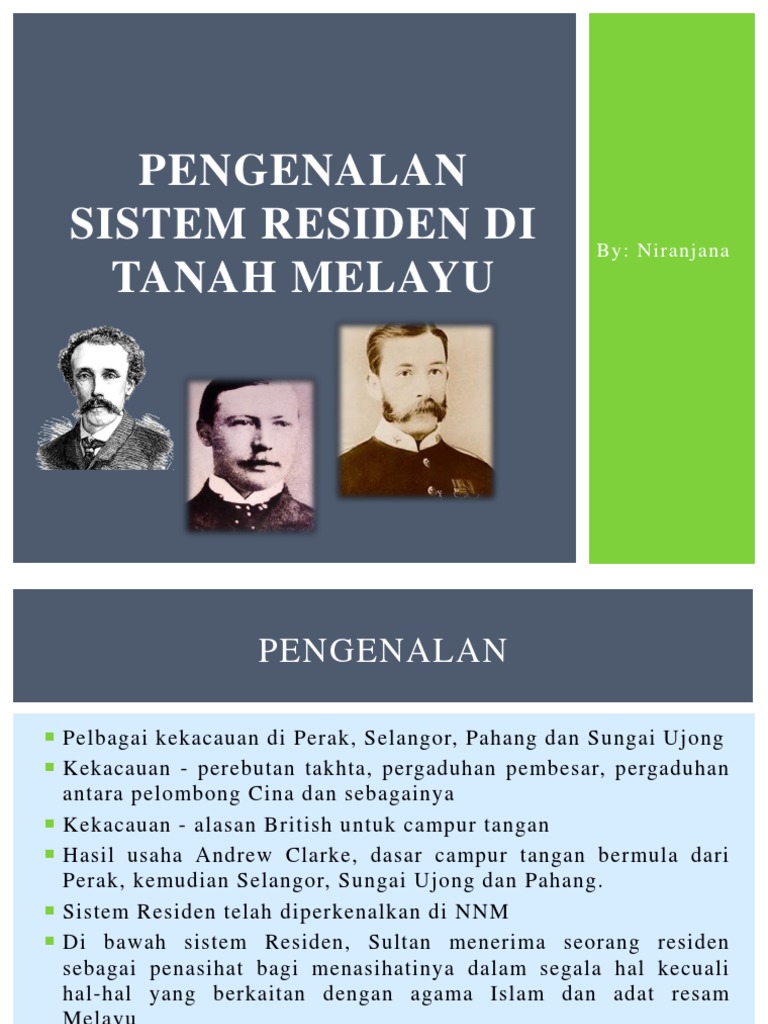 1 mengikut sistem residen residen ialah seoang pegawai british yang dilantik untuk menasihati sultan dan nasihatnya itu mesti dipatuhi dalam semua perkara kecuali berkaitan dengan agama islam dan adat istiadat melayu. British telah menempatkan j w w. Birch sebagai residen british yang pertama di perak. Sebelum british campur tanagn di tanah melayu secara rasmi pada tahun 1874 british mengamalkan dasat campur tangan secara tidak formal iaitu mereka terlibat dalam hal ehwal politik tempatan.