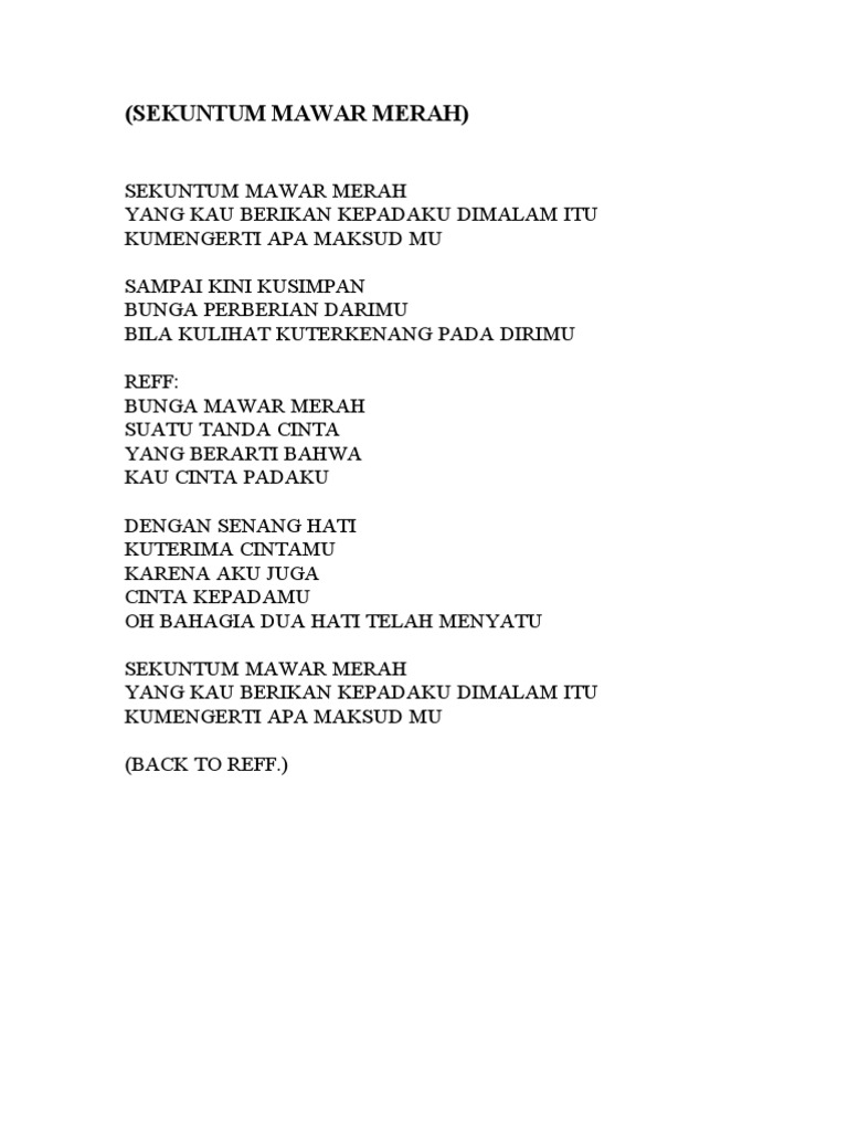 Lirik lagu sekuntum mawar merah sebuah puisi hattan. Sekuntum mawar merah yang kauberikan kepadaku di malam itu ku mengerti apa maksudmu sampai kini kusimpan bunga pemberian darimu tiap kulihat ku terkenang pada dirimu bunga mawar merah suatu tanda cinta yang berarti bahwa kau cinta padaku dengan senang hati kuterima cintamu. Tak pernah atau memberi kemewahan tapi ku yakin dia bahagia tanpa itu semua. Berulang kali kumencuba memujuk hati lupakan semua kenangan.