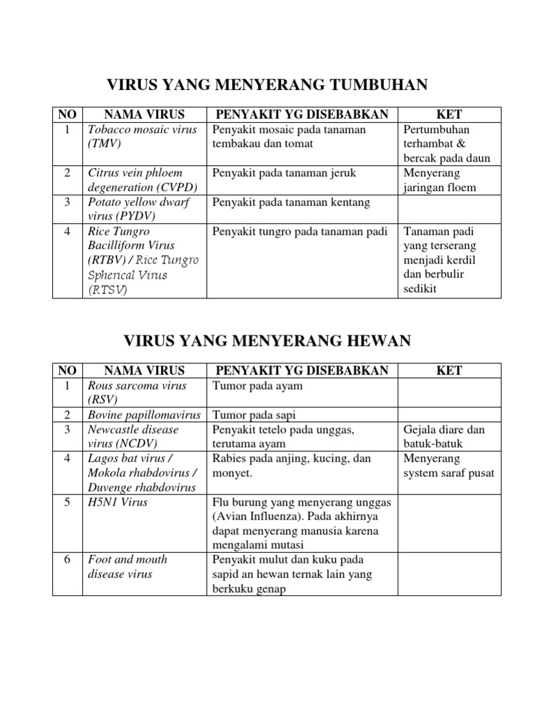 Tabel Penyakit Pada Hewan Yang Disebabkan Oleh Virus