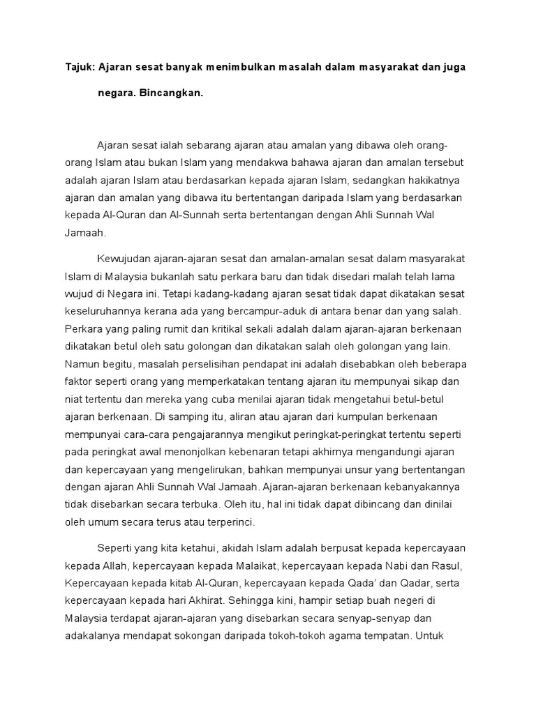 Mohd azam bin mohd amin2 kertas kerja ini membincangkan ajaran ajaran sesat di malaysia dengan menyoroti beberapa ide ide kumpulan kumpulan di era klasik moden pasca moden dan sinkritisme. Individu contoh contoh ajaran sesat di malaysia akidah seseorang akan rosak banyak masa terbuang dengan aktiviti yang tidak sihat dan bertentangan dengan ajaran islam pemikiran mereka akan sentiasa dikongkong oleh pemimpin ajaran sesat tindakan dan kelakuan mereka tidak rasional. Di selangor ajaran sesat pertama ialah ajaran ahmadiah atau qadiani yang bertapak di jeram pada 1930 an. Ajaran ayah pin pernah disenaraikan antara lima kumpulan ajaran sesat paling tegar dikesan di negara ini dan mula bergerak pada awal 1980 an selain beberapa ajaran lain lagi.