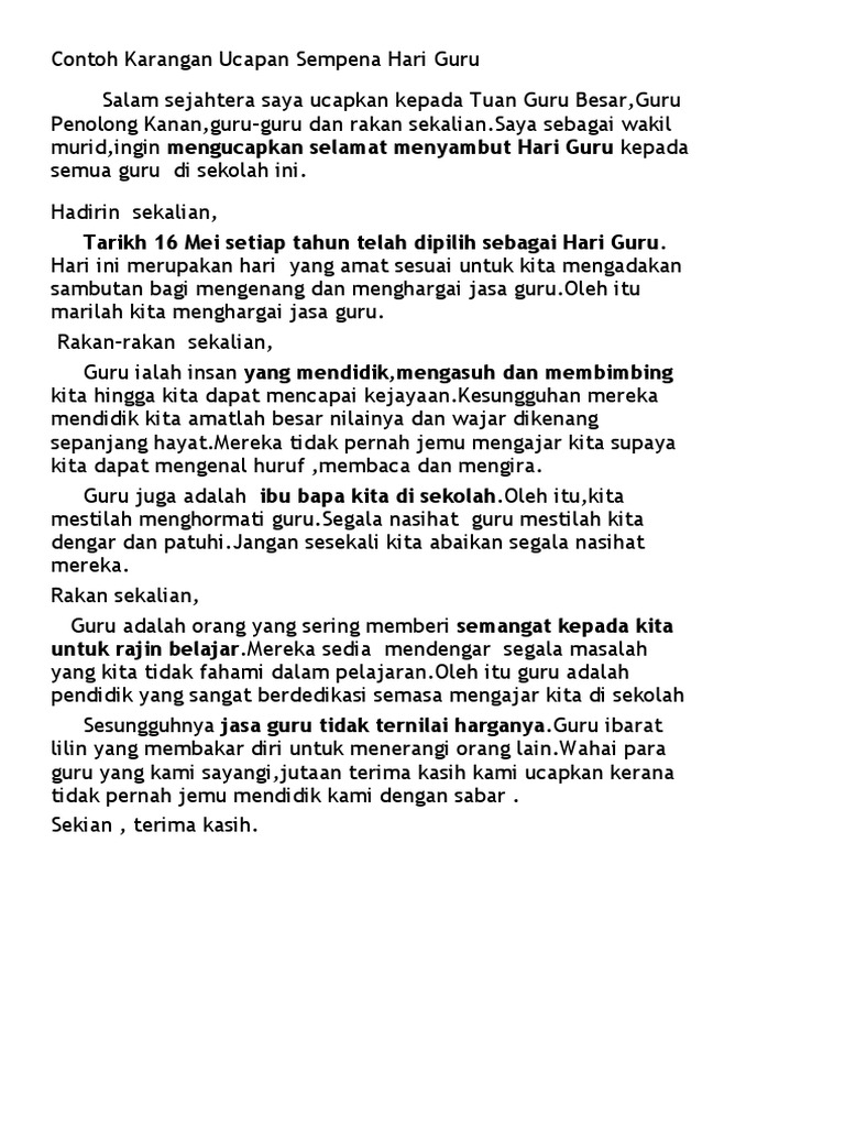 Terlebih dahulu terima kasih diucapkan kepada pihak majlis yang telah memberi peluang kepada saya untuk menyampaikan ucapan pada hari yang mulia ini. Majlis sambutan hari guru berakhir pada pukul 1 00 petang. Berdirinya saya di dewan keramat ini untuk menyampaikan sebuah ucapan yang bertajuk guru insan yang penting dalam kehidupan kita. Contoh karangan ucapan sempena hari guru.