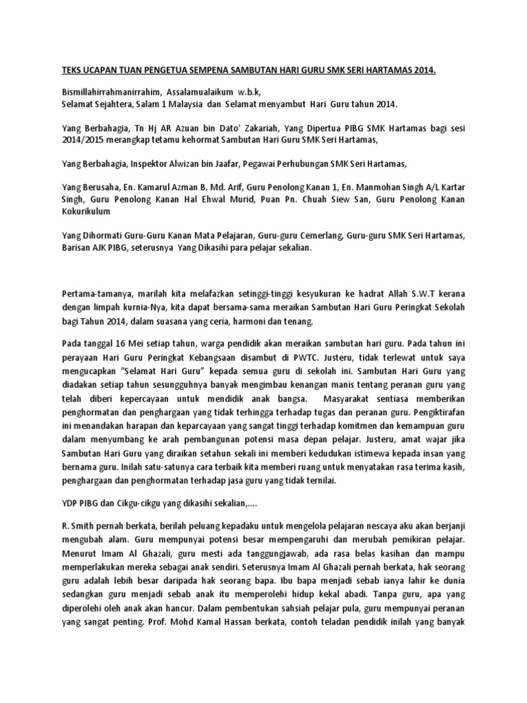 Kamu benar benar rela menghabiskan waktu bersama mereka tanpa berharap suatu imbalan apapun. Sambutan hari guru di malaysia yang diadakan pada tarikh 16 mei setiap tahun melambangkan penghargaan besar negara dan masyarakat kepada golongan itu di atas jasa dan bakti mereka. Pada tahun 2020 tema hari guru ialah berguru demi ilmu bina generasi baharu tema ini dipilih bersesuaian dengan peranan guru dalam memperkasa keilmuan dan profesionalisme bagi membina generasi baharu negara yang dapat memenuhi matlamat falsafah pendidikan kebangsaan. Author dennis posted on august 14 2019 august 14 2019 categories ucapan pengerusi majlis tags tek ucapan pengerusi majlis.
